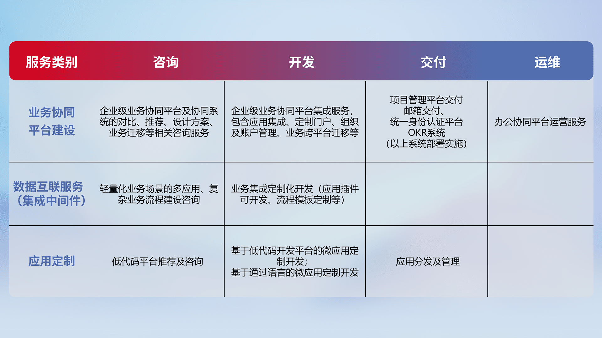 针对钉钉、、、企微、、、、IDaas等平台级产品提供产品的规划、、方案、、交付、、定制化开发等服务,,,,实现如统一协同办公、、、智能客户服务、、混合会议管理、、、智能数据查询、、、、等业务场景,,,,实现数字化转型。。